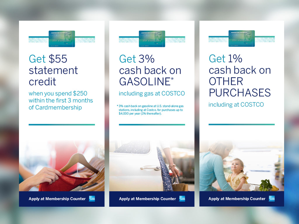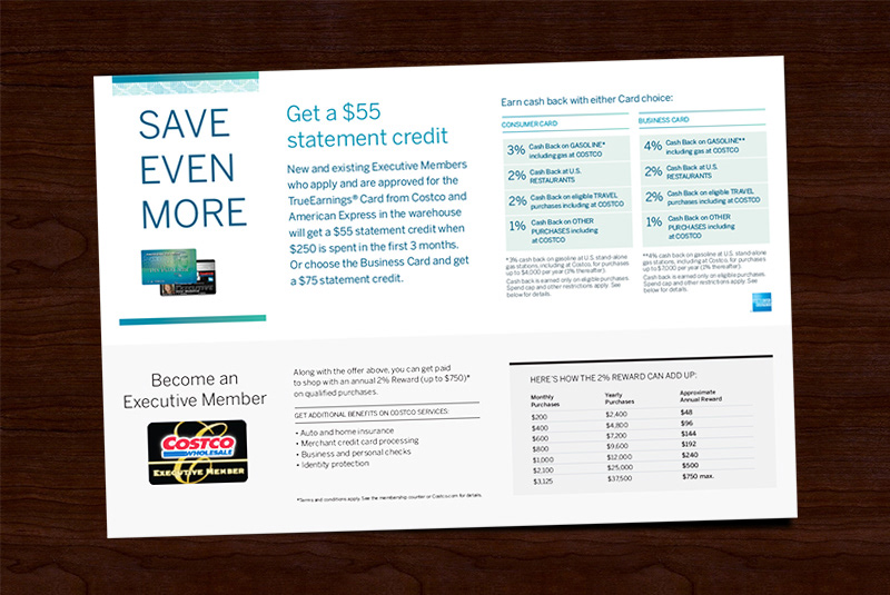 Directed and designed a Card acquisition signage to be displayed at Costco for American Express. Also worked with print shops to produce the banners.
